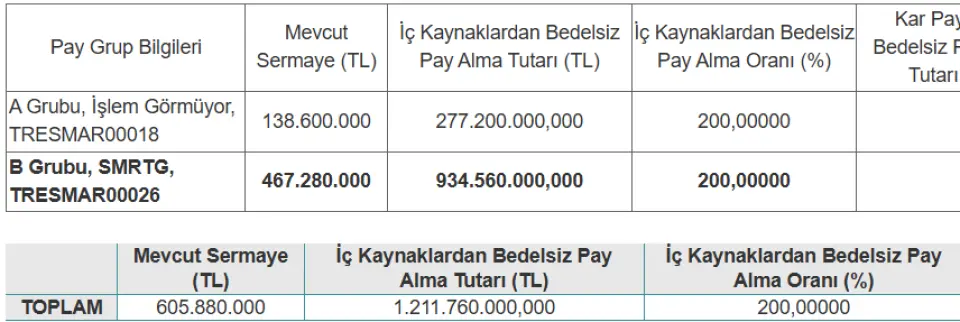 SMRTG mevcut 605.880.000 TL olan sermayesini %200 oranında bedelsiz artırarak 1.817.640.000 TL ye çıkartıyor.