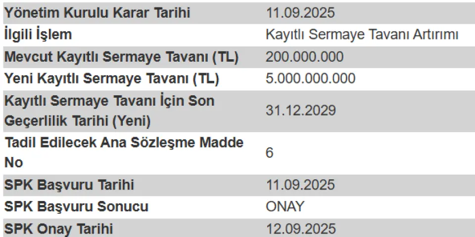 Şirketimizin 11.09.2025 tarihinde esas sözleşmenin "Sermaye" başlıklı 6'ncı maddesinin tadili kapsamında, kayıtlı sermaye tavanı tutarının 5.000.000.000.-TL'ye yükseltilmesini ve kayıtlı sermaye tavanının geçerlilik süresinin 2025-2029 yıllarını kapsayacak şekilde uzatılması amacıyla Sermaye Piyasası Kurulu'na (SPK) yapmış olduğu başvuru, SPK'nın 12.09.2025 tarihli ve E-29833736-110.04.04-78125 sayılı yazısı ile onaylanarak 12.09.2025 (bugün) tarihinde tarafımıza tebliğ edilmiş olup, SPK onaylı tadil metnine ekte yer verilmektedir.