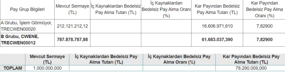 CWENE mevcut 1 milyar TL TL olan sermayesini %7,829 oranında bedelsiz artırarak 1.078.290.009 TL ye çıkartıyor.