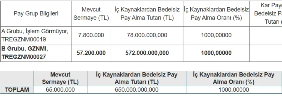 GZNMI mevcut 65 milyon Lira olan sermayesini %1000 oranında bedelsiz artırarak 715 milyon Liraya çıkartıyor.