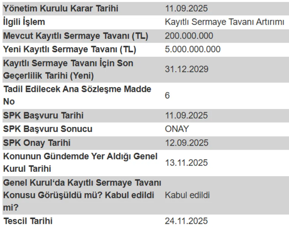 Şirketimiz esas sözleşmesinin "Sermaye" başlıklı 6'ncı maddesinin tadili kapsamında, kayıtlı sermaye tavanı artırımı ve süresinin uzatımına ilişkin, Sermaye Piyasası Kurulu'nun 12.09.2025 tarihli ve E-29833736-110.04.04-78125 sayılı, T.C. Ticaret Bakanlığı'nın ise 22.09.2025 tarihli ve E-50035491-431.02-00113766668 sayılı yazısı ile onaylanan ekli dokümantasyonda yer alan esas sözleşme tadil metni tasarısı 13.11.2025 tarihinde gerçekleştirilen Şirketimiz olağanüstü genel kurul toplantısında kabul edilmiş olup, 24.11.2025 tarihinde (bugün) Ticaret Sicili Müdürlüğü tarafından tescil ve ilan edilmiştir.