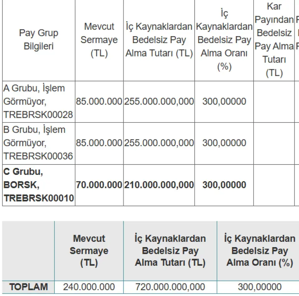 Yeni sermayeyi temsil eden 720 milyon TL nominal hisseye karşılık gelen 720 milyon lot hisse hak sahibi yatırımcılara bedelsiz şeklinde verilecek. Bedelsiz sermaye artırımında hesabında 200 lot BORSK hissesi bulunan yatırımcılar, herhangi bir ödeme yapmadan 800 lotun sahibi olacak. Üstelik yatırımcılar bu işlem için de herhangi bir başvuru yapmayacak.