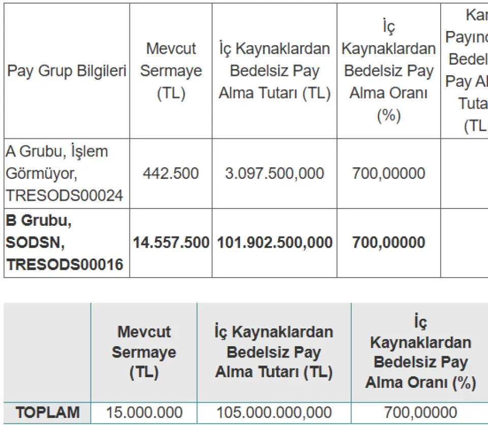 SODSN mevcut 15 milyon Lira olan sermayesini %700 oranında bedelsiz artırarak 120 milyon Liraya çıkartıyor.