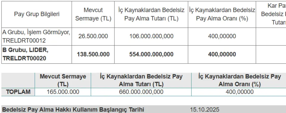 LIDER mevcut 165 milyon Lira olan sermayesini %400 oranında bedelsiz artırarak 825 milyon Liraya çıkartıyor.