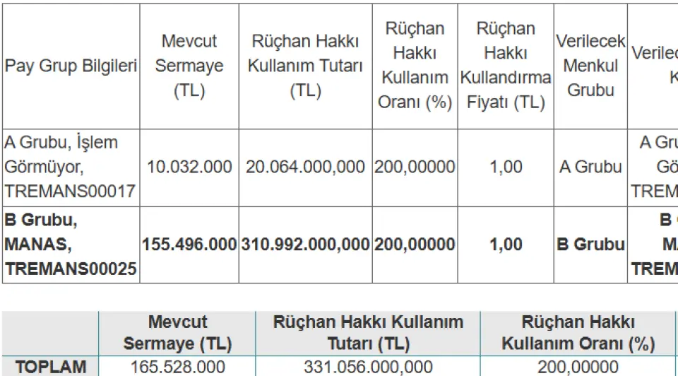 Manas Enerji %200 Bedelli Sermaye Artırımını SPK Onayına Gönderdi. Şirket %200 bedelli sermaye artırımına onay almak üzere Sermaye Piyasası Kurulu' na başvuru yaptı. Şirketin yeni sermayesi 496.584.000 TL olacak.