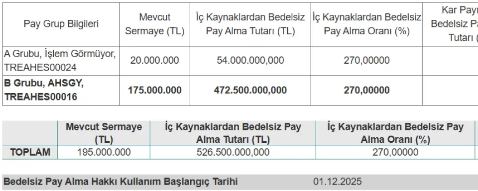 Ahes Gayrimenkul (AHSGY) bedelsiz sermaye artırımını 1 Aralık pazartesi günü gerçekleştiriyor. Şirket %270 oranında bedelsiz sermaye artırımı yapacak.