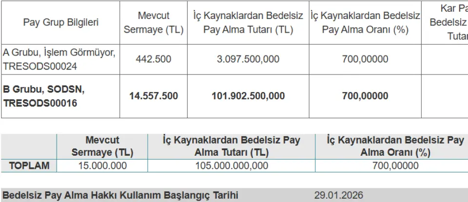 SODSN %700 dev bedelsiz sermaye artırımı için tarih açıkladı. Şirket 29 Ocak perşembe günü %700 bedelsiz sermaye artırımını gerçekleştirecek. Hesabında SODSN hissesi olmayan yatırımcılar da bu dev bedelsiz sermaye artırımından yararlanabilir henüz geç değil! İşte ayrıntılar: