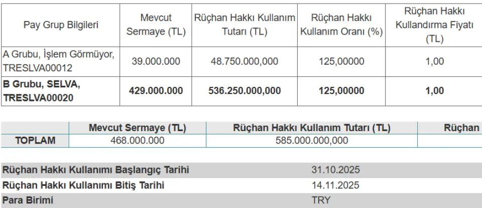 SELVA mevcut 468.000.000 TL olan sermayesini %125 bedelli artırarak 1.053.000.000 TL ye çıkartıyor. Bedelli sermaye artırımında rüçhan hakkı fiyatı 1 TL nominal fiyattan kullandırılacak.