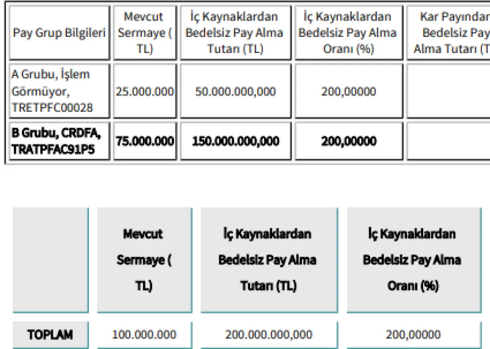 Yeni sermayeyi temsil eden 200 milyon Lira nominal hisse, yani 200 milyon lot hisse hak sahibi yatırımcılara bedelsiz hisse olarak dağıtılacak.