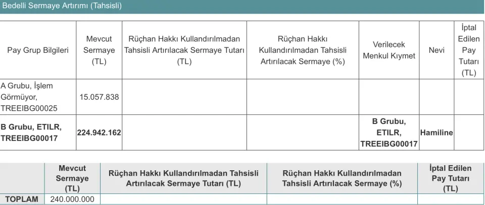 "Şirketimiz Yönetim Kurulu'nun 15.12.2025 tarihli kararı ile; mevcut ortakların rüçhan hakları kısıtlanarak, ihraç edilecek payların tamamının, Şirketimiz Yönetim Kurulu Başkanı Sayın İzzettin Kaplan'dan kullanılan nakit fonlar nedeniyle oluşan ve tamamı muaccel hale gelmiş bulunan 64.175.957,59 TL tutarındaki Şirketimiz borçlarına mahsup edilmek üzere kendisine tahsisli olarak satılmasına, söz konusu payların Borsa İstanbul A.Ş.'nin ilgili düzenlemeleri çerçevesinde belirlenecek satış fiyatından az olmamak üzere ihraç edilmesine ve kaydi pay olarak oluşturulmasına karar verilmişti. Bu kapsamda, anılan borçların tahsisli sermaye artırımı yoluyla kapatılmasına yönelik olarak gerçekleştirilecek sermaye artırımı işlemleri için Sermaye Piyasası Kurulu'na izin başvurusu 18 Aralık 2025 tarihinde yapılmıştır.