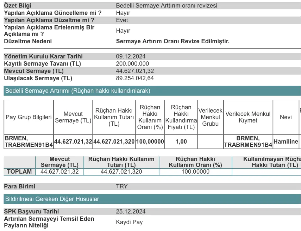 BRMEN Bedelli Sermaye Artırımına İlişkin KAP Duyurusu
