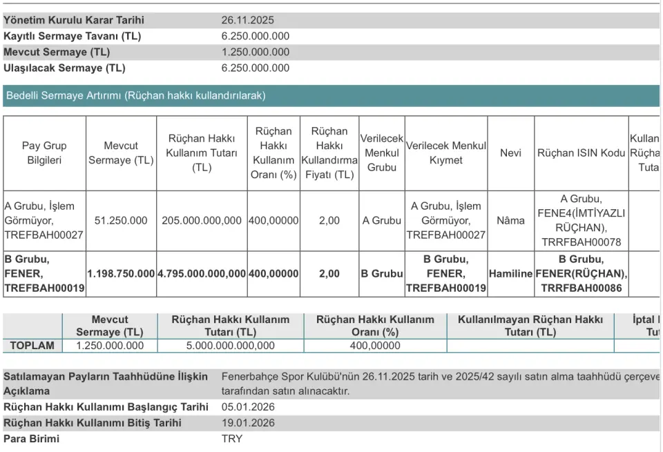 SPK, yılın son bülteninde FENER'in bedelli sermaye artırımını onaylamıştı. Fenerbahçe, 6.250.000.000.TL kayıtlı sermaye tavanı içerisinde, 1.250.000.000 TL olan çıkarılmış sermayesinin tamamı nakden karşılanmak suretiyle 5.000.000.000.TL bedelli olarak , %400 artırılarak 6.250.000.000 TL'ye yükseltilmesine yönelik rüçhan hakkı kullanım başlangıç tarihinin 5 Ocak .2026 olarak belirlenmesine karar verdi.