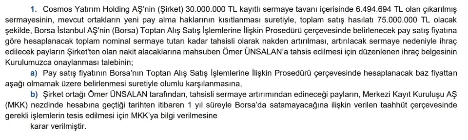 Cosmos, Kamuyu Aydınlatma Platformu (KAP) aracılığı ile yatırımcılarını bilgilendirmişti. Cosmos Yatırım Holding A.Ş.’nin 6,49 milyon TL tutarındaki pay ihracını tahsisli satış yöntemi ile yapması SPK tarafından onaylandı.