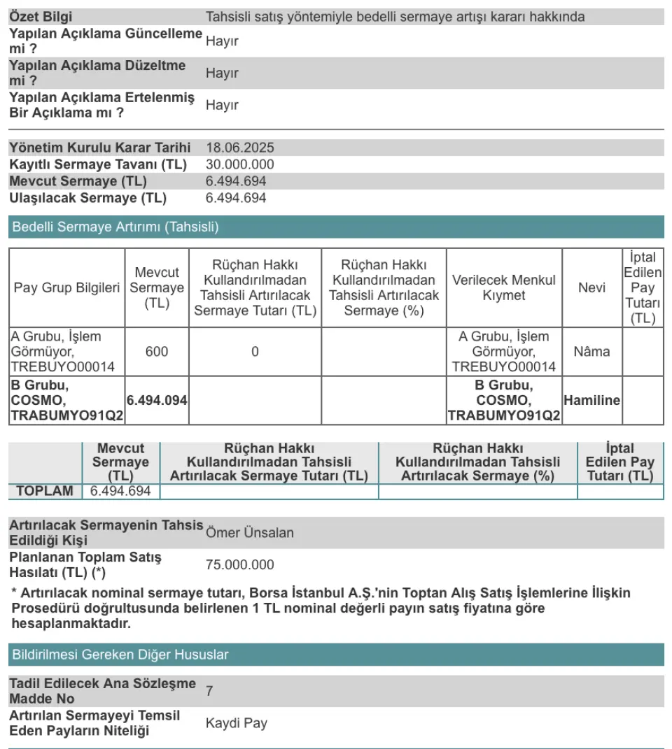 COSMO Sermaye Artırımı Hakkında KAP Açıklaması