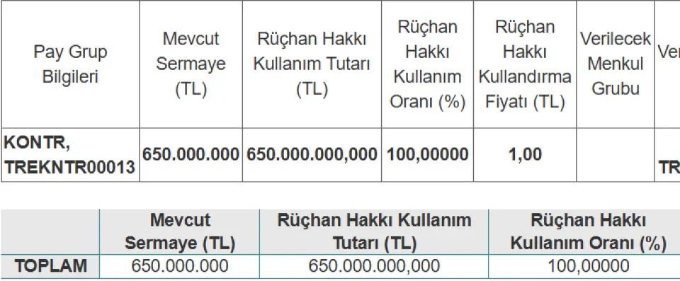 KONTR %100 bedelli sermaye artırım kararını KAP bülteninden duyurdu. Şirket mevcut 650 milyon TL olan sermayesini %100 bedelli artırarak 1 milyar 300 milyon TL ye çıkartıyor.
