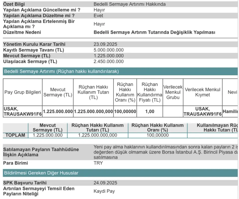 USAK %200 sermaye artırım oranını revize ettiğini açıkladı! Şirket tarafından KAP aracılığı ile yapılan bilgilendirmede yeni orana ve sermaye artırımına ilişkin detaylara yer verildi.