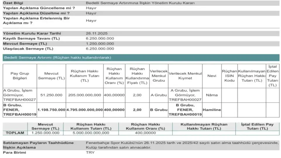 FENERBAHÇE FUTBOL A.Ş. (FENER), bedelli sermaye artırımı kararı aldığını geçtiğimiz ay açıklamıştı. Mevcut sermaye 1.250.000.000 TL’den, 5.000.000.000 TL bedelli sermaye artırımı ile 6.250.000.000 TL’ye yükseltecek. Bedelli sermaye artırımı oranı %400 olarak duyuruldu. Mevcut ortakların yeni pay alma haklarının 1 TL nominal değerli her bir pay için 2 TL fiyattan kullandırılacağı da açıklandı.