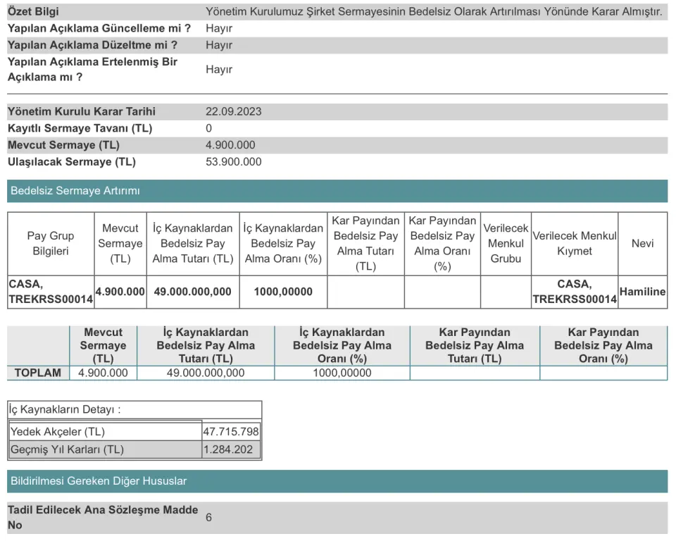 Casa Emtia Petrol Kimyevi ve Türevleri Sanayi ve Ticaret A.Ş. (CASA), %1000 bedelsiz sermaye artırım kararı almıştı. Casa Emtia'nın bedelsiz kararı, 22 Eylül 2023 tarihinde Kamuyu Aydınlatma Platformu'nda (KAP) paylaşılmıştı.
