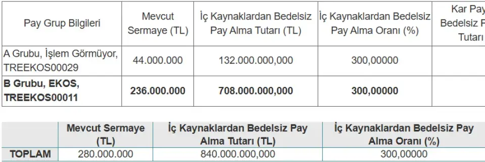Bu doğrultuda şirket 280 milyon TL olan mevcut sermayesini %300 oranında artış ile 1 milyar 120 milyon TL'ye çıkartacak. %300 bedelsiz sermaye artışının Sermaye Piyasası Kurulu (SPK) tarafından onaylanması durumunda yatırımcıların elindeki 100 lot 400 lota yükselecek. SPK onayının ne zaman geleceği ise henüz belli değil.