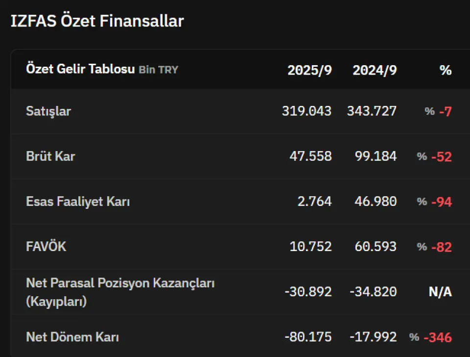 IZFAS son açıklanan 3. çeyrek bilançosunda zarar oranını %346 oranında artırmıştı. Şirket geçen yıl 9 aylık bilançosunda 17.992.000 TL zarar açıklamıştı. Bu yıl 9 aylık bilançoda zarar 80.175.000 TL ye çıktı.