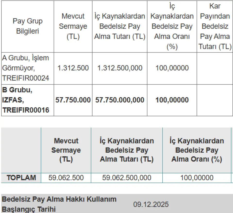 Şirketimizin 09.12.2025-23.12.2025 tarihleri arasında rüçhan hakkı kullandırılacak bedelli bedelsiz sermaye artırımına ilişkin Takasbank tarafından ISIN kodu tahsis edilmiş, söz konusu ISIN kodu A grubu imtiyazlı paylar için TRRIFIR00042, B grubu için ise TRRIFIR00034 olarak belirlenmiştir.