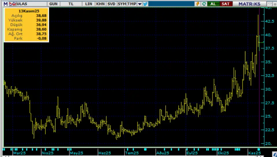 ULAS Ekim ayının hızlı hisselerinden. Hisse 9 Ekim günü 25 TL fiyattan hızlı bie yükselen trende başladı. Öncesinde de ağır ağır primlenen hisse, hızlanarak 1 ayda 43,66 TL zirve fiyata kadar yükseldi.