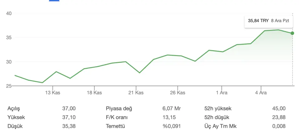 Son 1 yılda %8,28 değer kaybı yaşayan ARDYZ hissesi yılbaşından bu yana ise %10,04 değer kaybı yaşadı. Son 6 ayda ise yatırımcısına kazandıran hisse, %25,72 değerlendi. Son 1 ayda ise %31,27 değerlendi. Açıkladığı yeni işler sonrası da ARDYZ, son 5 günde %10,73 değer kazandı. Bugün %2,41 değer kaybeden hisse 35,84 TL'den işlem görüyor.