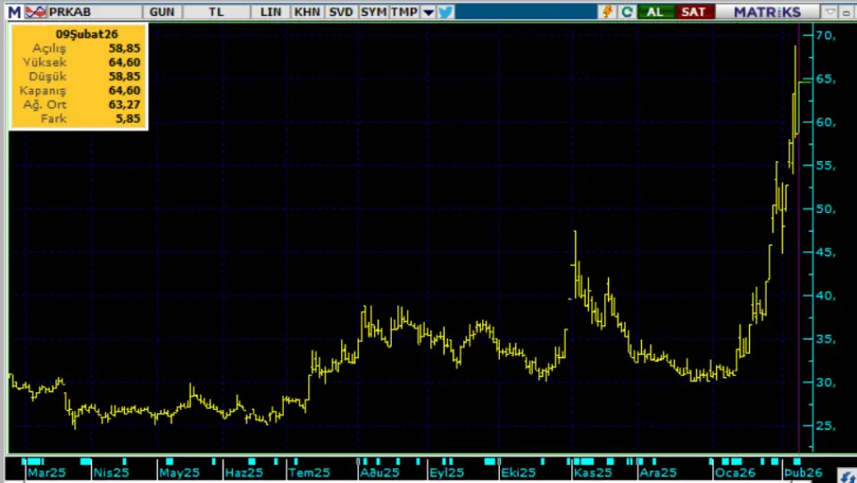 PRKAB son günlerde borsada yükselen hisse. Hisse, 13 Ocak günü 31 TL civarı fiyatlardan hızlı bir yükseliş trendine başladı. 1 aydan kısa sürede 68,80 TL zirve fiyata kadar primlendi. Kısa sürede %100 den fazla prim yapan hissede, kredili işlem ve açığa satış 1 ay süreyle yasaklandı.