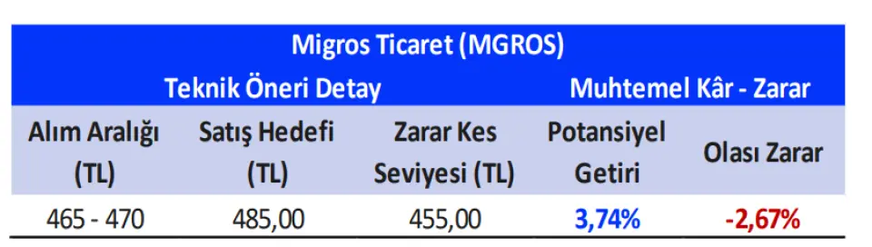 Aracı kurum Migros Ticaret (MGROS) için bir fiyat aralığında alım aralığı vermiş. Bu tutar 465 - 470 Türk Lirası aralığında olarak açıklanmış.