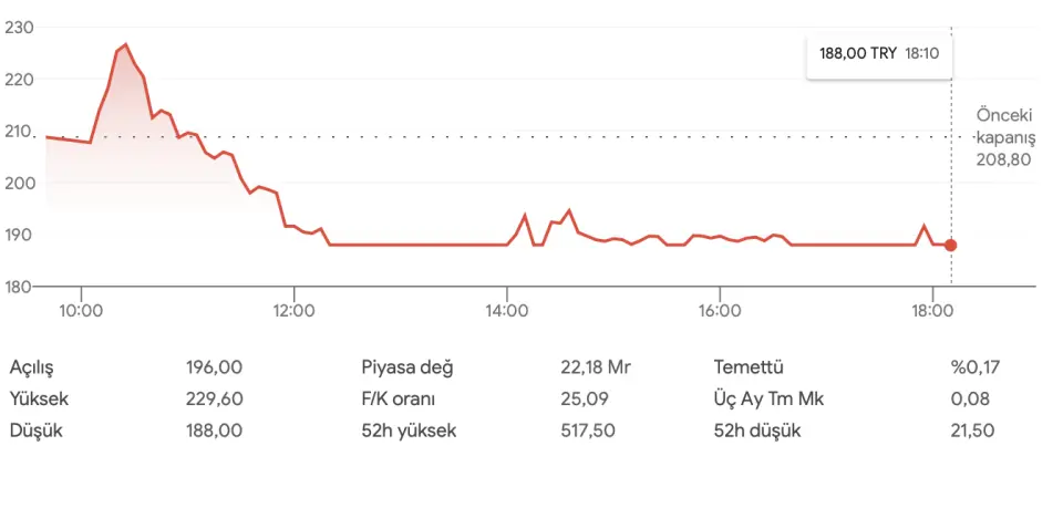 22 TL'den 286,25 TL'leri gören hisse, 5 günlük TABAN serisini geçtiğimiz hafta 16 Aralık 2025'te TAVAN'a kitlenerek bitirmişti. Sonrasında bir düşen bir yükselen hisse, dünkü işlem gününde %9,96 değer kaybetti. Güne 207,70 TL'den başlangıç yapan SMRVA, günü 188 TL'den noktaladı.