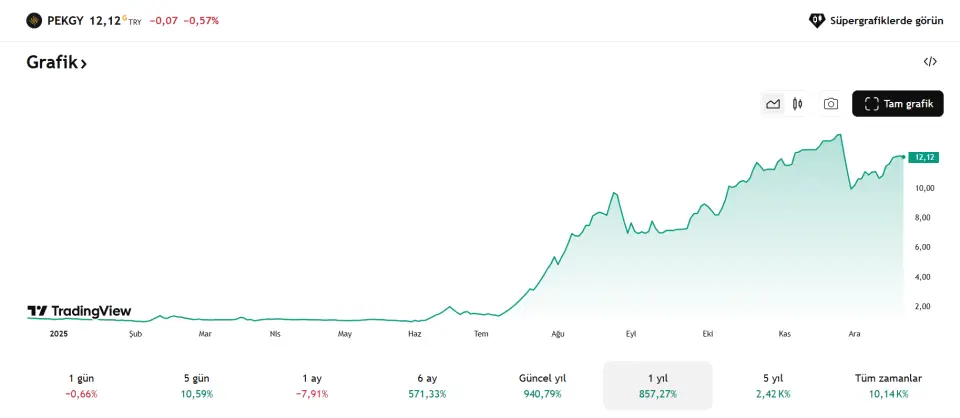 Peker GYO (PEKGY), geride kalan bir yıllık süreçte Borsa İstanbul’un en zayıf performans gösteren hisseleri arasında yer aldı. Hissede yaşanan sert satışlarla birlikte yaklaşık %85’lik bir değer kaybı görülürken, fiyat uzun süre düşük seviyelerde yatay bir görünüm sergiledi.
