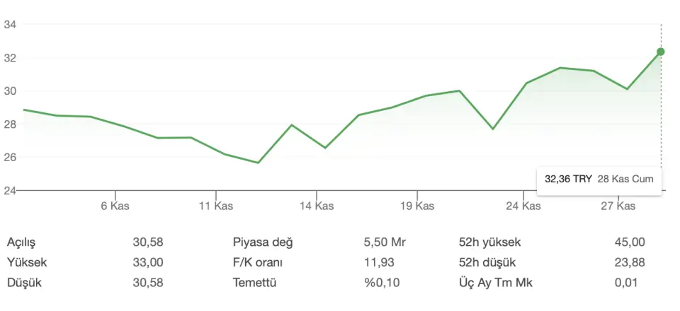 ARDYZ hissesi geçtiğimiz haftanın son işlem günü olan 28 Kasım 2025'te %7,51 değer kazandı. Hisse 31 TL'den güne başlarken gün sonu 32,36 TL'yi gördü. Son 1 ayda %12,13 değer kazanan ARDYZ, son 6 ayda ise %23,79 değerlendi. Yılbaşından beri ise %18,41 kaybettiren hisse, son 1 yılda da %13,29 değer kaybı yaşadı.