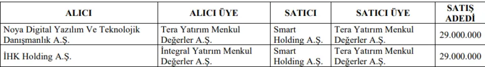 Satılan payları alacak olan alıcılar Noya Digital Yazılım ve Teknolojik Danışmanlık AŞ ve İHK Holding AŞ. Satış işlemi Toptan Alış Satış pazarında gerçekleşecek ve fiyat 28,5 TL olacak.