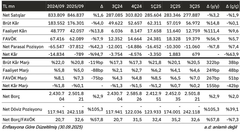 - "3. çeyrekte holdingin net satışları geçen senenin aynı çeyreğine göre %3,20 azalışla 277.887 milyon TL olmuştur. 2025 yılının ilk 9 ayında net satışları %1,56 artışla 846.837 milyon TL seviyesinde gerçekleşmiştir. FAVÖK‘ü 3. çeyrekte önceki yılın aynı çeyreğine oranla %56,89 yükseliş ile 19.379 milyon TL olmuştur. 2025'in ilk 9 ayında bir önceki yılın aynı dönemine oranla FAVÖK’ü %7,90 azalışla 62.089 milyon TL seviyesinde gerçekleşmiştir."