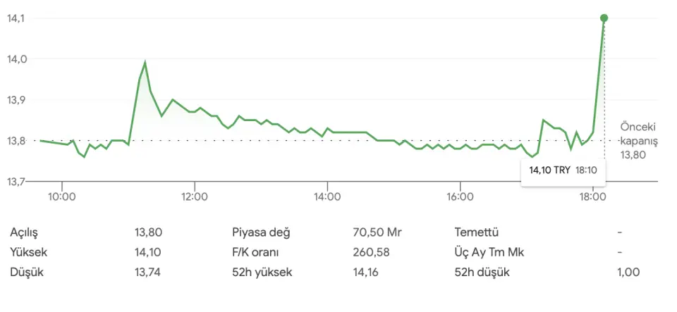 %106529 kazandırmıştı! 1 aydır hareketsiz hisseyi Tera canlandırdı. Borsa İstanbul'un ilgi çeken hisselerinden PEKGY'deki fiyat değişimleri yakından takip edilmeye devam ediyor.Son 1 yılda yatırımcısına %1.065,29 kazandıran PEKGY hissesi, geçen sene 25 Aralık 2024'te 1,24 TL'den işlem görüyordu. Yılbaşından bu yana da %1.094,92 değer kazanan hisse, son 6 ayda ise %734,32 değerlendi. Son 1 aylık hisse grafikleri incelendiğinde ise sadece %3,37 değerlenen hisse, son 5 günde de %15,48 değer kazanımı elde etti. PEKGY son işlem gününü de %2,17 değerlenelerek kapattı.