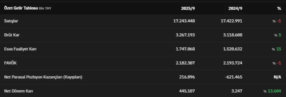 FAVÖK 2025 yılının üçüncü çeyreğinde 2.182.307.000 TL olarak açıklandı. Net parasal pozisyon kazançları 2025 yılının üçüncü çeyreğinde 216.096.000 TL olarak kaydedildi. Net dönem kârı ise 445.107.000 TL olarak kaydedildi. İlgili veri 2024 yılının üçüncü çeyreğinde 3.247.000 TL olarak açıklanmıştı. Böylece ilgili veri %13.604 artmış oldu.