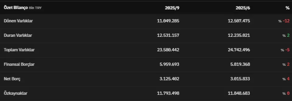 Dönen varlıklar 2025 yılının üçüncü çeyreğinde 11.049.285.000 TL olmuştur. 2025 yılının üçüncü çeyreğinde 12.531.157.000 TL olarak açıklanan duran varlıklar, 2025 yılının ikinci çeyreğinde 12.235.021.000 TL olarak açıklanmıştı. Böylece duran varlıklar %2 artmış oldu. Toplam varlıklar üçüncü çeyrekte 23.580.442.000 TL olarak kaydedildi. Finansal borçlar 2025 yılının üçüncü çeyreğinde 5.959.693.000 TL olarak kaydedildi.2025 yılının üçüncü çeyreğinde net borç 3.125.402.000 TL olarak açıklandı. Özkaynaklar 2025 yılının üçüncü çeyreğinde 11.793.498.000 TL olarak açıklandı. İlgili veri 2025 yılının ikinci çeyreğinde 11.848.683.000 TL olarak açıklanmıştı.