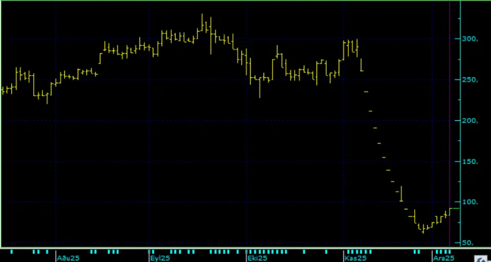 Kasım ayı başlarında 300 TL fiyattan taban taban geri gelen hisse, 15 işlem günü içinde 61 TL fiyata kadar düşmüş ve %80 değer kaybetmişti. 61 TL dip fiyattan toparlanmaya geçen hisse, bu günlerde 90 TL civarı fiyatlarda. Hissenin cuma kapanış fiyatı 92,25 TL.