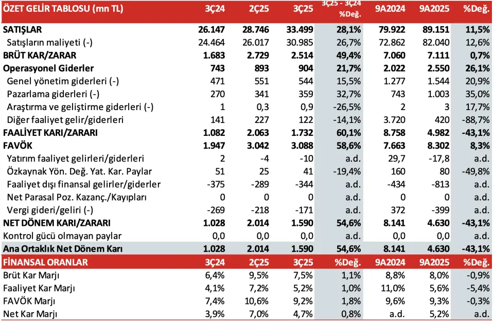 - "Şirket, geçtiğimiz yılın aynı dönemindeki 375mn TL'lik net finansman giderine karşın bu çeyrekte Şirket 344mn TL net gider kaydetmiştir. 171mn TL'lik net vergi geliri sonrası Şirket'in net dönem karı 1.590mn TL olarak gerçekleşmiştir. 3. çeyrek karı sonrasında Şirket'in 9 aylık net dönem karı 4.630mn TL'ye ulaşmıştır. (9A2024: 8.141mn TL net dönem karı)."