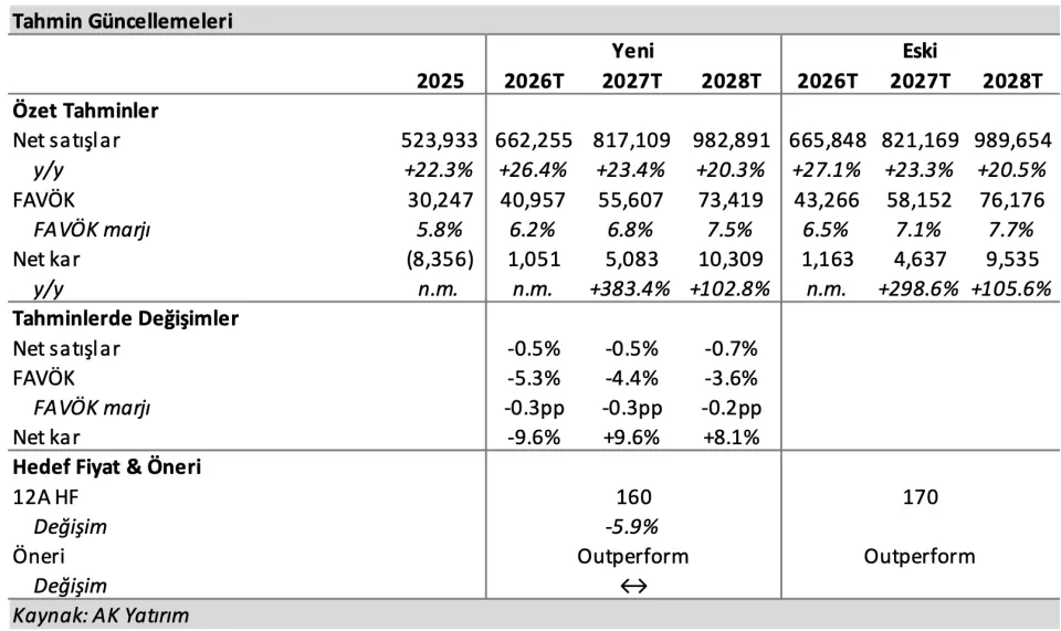 Akbank tahminlerle bilanço karşılaştırması yaptı. Net zararın, daha düşük finansman gideri ve yeniden yapılandırmaya ilişkin bazı karşılık iptalleri sayesinde beklentilerden daha iyi gerçekleştiğini kaydetti (Konsensüs: 2,16 milyar TL, AK: 2,43 milyar TL). Cironun beklentilerle genel olarak uyumlu gerçekleştiğini (Konsensüs: 129,32 milyar TL, AK: 124,38 milyar TL) aktaran aracı kurum, FAVÖK konsensüsle uyumlu (6,78 milyar TL) olmakla birlikte, daha zayıf FAVÖK marjı nedeniyle tahminlerin %11 altında (7,38 milyar TL) kaldığını belirtti.
