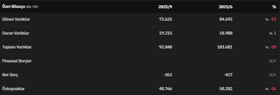 2025 yılının üçüncü çeyreğinde net borç -363.000 TL olarak açıklandı. Özkaynaklar 2025 yılının üçüncü çeyreğinde 48.766.000 TL olarak açıklandı. İlgili veri 2025 yılının ikinci çeyreğinde 58.282.000 TL olarak açıklanmıştı.
