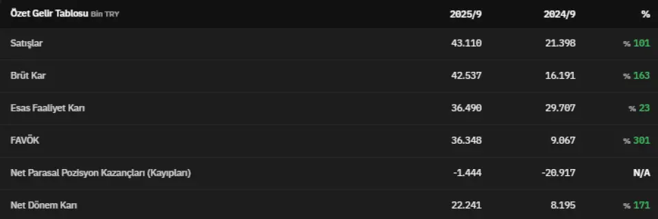 FAVÖK 2025 yılının üçüncü çeyreğinde 36.348.000 TL olarak açıklandı. 2024 yılının üçüncü çeyreğinde 9.067.000 TL olarak açıklanan FAVÖK 2025 yılının üçüncü çeyreğinde %301 artmış oldu. Net parasal pozisyon kazançları 2025 yılının üçüncü çeyreğinde -1.444.000 TL olarak kaydedildi. Net dönem kârı ise 22.241.000 TL olarak kaydedildi. İlgili veri 2024 yılının üçüncü çeyreğinde 8.195.000 TL olarak açıklanmıştı. Böylece net dönem karı 2025 yılının üçüncü çeyreğinde %171 artmış oldu.