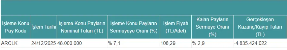 22.12.2025 tarihli özel durum açıklamamızda belirtildiği üzere, Şirketimiz gelir tablosunu etkilemeyecek söz konusu işlem kapsamında, 30.11.2025 tarihli satın alma gücüne göre endekslenmiş maliyeti 10.033.344.021 TL olan geri alınan payların satışından geçmiş yıl karları/zararları kaleminde aşağıdaki tabloda yer verilen 4.835.424.022 TL tutarındaki azalışın muhasebeleştirilmesi, ayrıca özkaynaklar altında kısıtlanmış yedekler içerisinde izlenen 10.033.344.021 TL tutarındaki geri alınan paylara ilişkin yedeklerin de serbest bırakılarak geçmiş yıl kârları/zararları kalemine sınıflandırılması öngörülmektedir. Böylece işlem sonucunda, geçmiş yıl karları kaleminde ve toplam özkaynaklarda nette 5.197.920.000 TL tutarında artış oluşması öngörülmektedir. İşlemin nihai etkisi kamuya açıklanacak 2025 yılı finansal tablolarımızdan takip edilebilecektir.