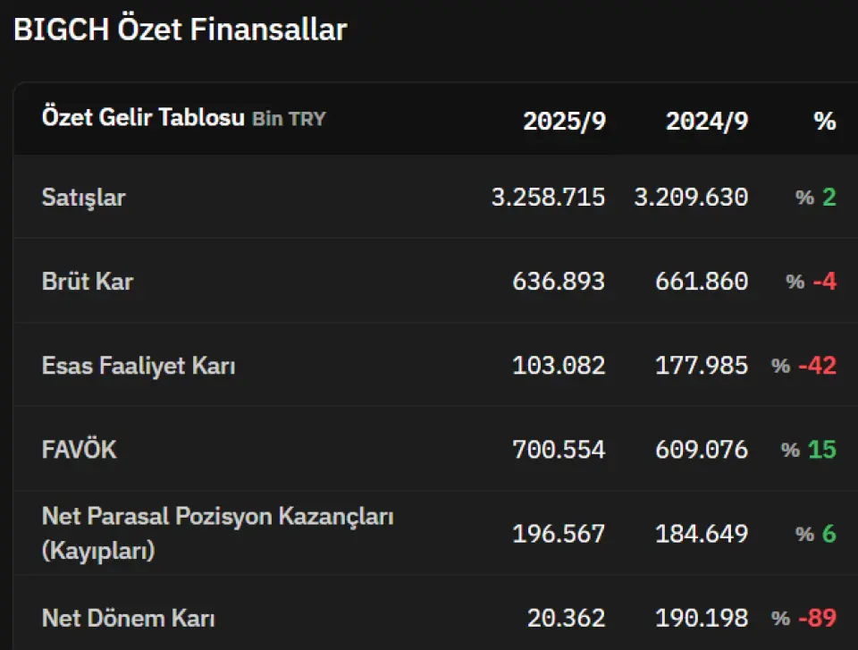 BIGCH geçen yıl 3. çeyrekte 190.198.000 TL kar rakamı açıklamıştı. Şirket bu yıl 3. çeyrekte karını %89 azaltarak 20.362.000 TL kar rakamı açıkladı.