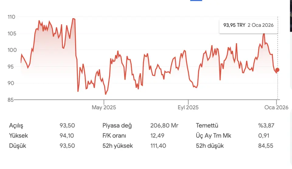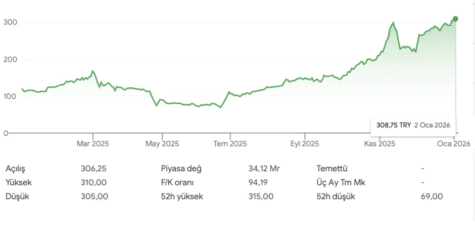 ODINE Hissesinde Son DurumSabah saatlerinde sipariş gelişmesini duyuran ODINE hissesi, 2026'nın ilk işlem gününe 306,25 TL'den başlangıç yaptı. Son 1 yılda yatırımcısına %156,22 kazandıran hisse, son 6 ayda ise yaklaşık %191 değerlendi. Son 1 ayda %28'e yakın değer kazanımı elde eden ODINE, son 5 günde de yaklaşıl %5 yükseldi.Yıllık TCELL Hisse Grafiği: