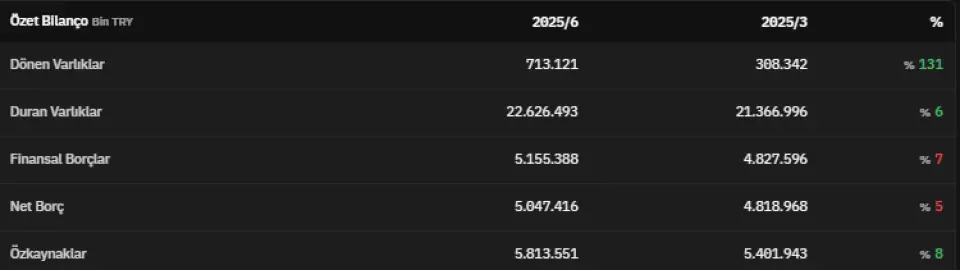 Dönen varlıklar 2025 yılının ikinci çeyreğinde 713.121.000 TL olarak açıklandı. 2025 yılının ikinci çeyreğinde 22.626.493.000 TL olarak açıklanan duran varlıklar ise, 2025 yılının ilk çeyreğinde 21.366.996.000 TL olarak açıklanmıştı. Finansal borçlar 2025 yılının ikinci çeyreğinde 5.155.388.00 TL olarak açıklandı.
