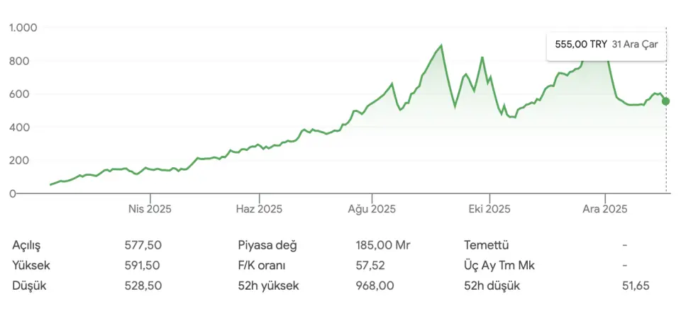 2025 yılının son işlem günü olan 31 Aralık 2025'te hisse güne 579,50 TL'den başlangıç yapmıştı. Hisse gün içinde %4,48 değer kaybederek 555 TL'den kapanış yaptı. Böylece DSTKF yatırıımcısına son 1 yılda %974,54 kazandırmış oldu. Son 6 ayda ise %47,41değer kazandı. Son 1 ayda hisse %29,92 değer kaybetse de yılın şampiyonu olmayı başardı.