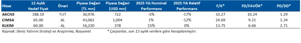 2026'da AKCNS, CIMSA ve KLKIM'den hangileri ALınır belli oldu. Deniz Yatırım, hisselere ilişkin hedef fiyatları da yatırımcıları ile paylaştı.