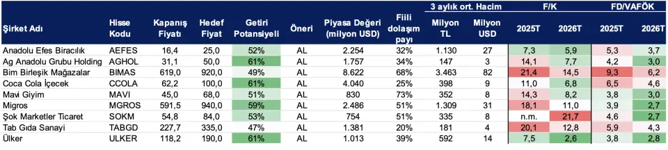 En çok tercih ettiklerimiz: MGROS ve CCOLA. İnceleme kapsamımızdaki tüketim sektörü şirketleri içinde 2026 için öne çıkan gıda perakendecisi olarak, çeşitlendirilmiş mağaza formatları ve süregelen maliyet optimizasyonu sayesinde MGROS’u öne çıkarıyoruz. CCOLA ise güçlü uluslararası ağı ve yurt içi marjlardaki toparlanma beklentisiyle cazip bir risk- getiri profili sunuyor; bu toparlanmanın mevcut değerlemelere tam yansımadığını düşünüyoruz. İnceleme kapsamımızdaki tüketim sektörü şirketlerinin tamamı için “AL” önerimizi yineliyoruz.