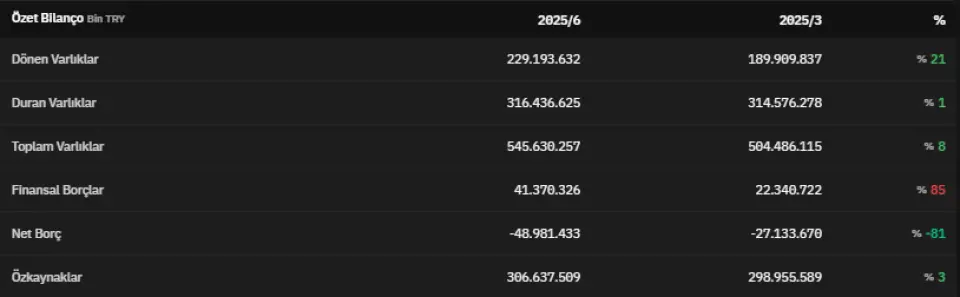 Toplam varlıklar 2025 yılının ikinci çeyreğinde 545.630.257.000 TL olarak açıklanmıştır. Finansal borçlar 2025 yılının ikinci çeyreğinde 41.370.326.000 TL olarak açıklandı.